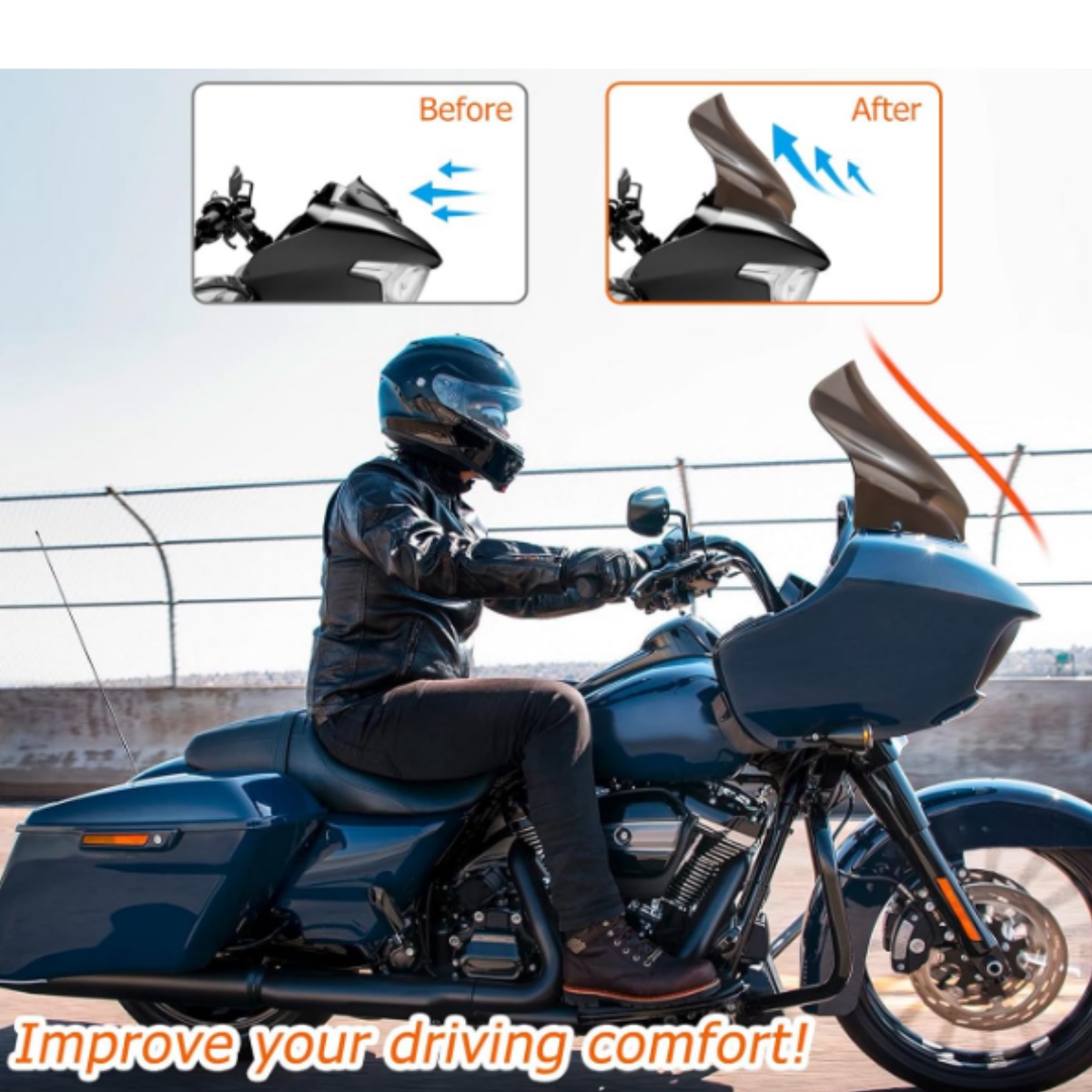 3.The flip at the tip directs air over the rider to help eliminate the swirl of air found in front of the rider on standard windshields.Reduce wind blast to the rider's body. Protect rider from the wind, thrown-up rocks, debris, and bugs.Don't just block or push the air, use the air for you, redirecting the wind to improve your ride.Keeps you comfortable for the long highway haul.