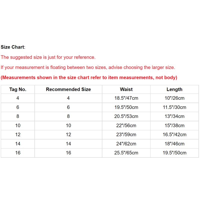 | Tag No. | Recommended Size for Kids | Waist | Length |
