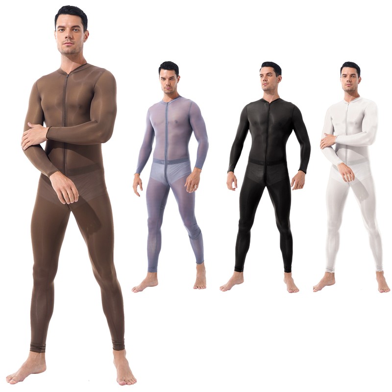 Men Lingerie Long Sleeves Double Zipper Sheer Smooth Open Crotch Bodysuit Jumpsuit.
