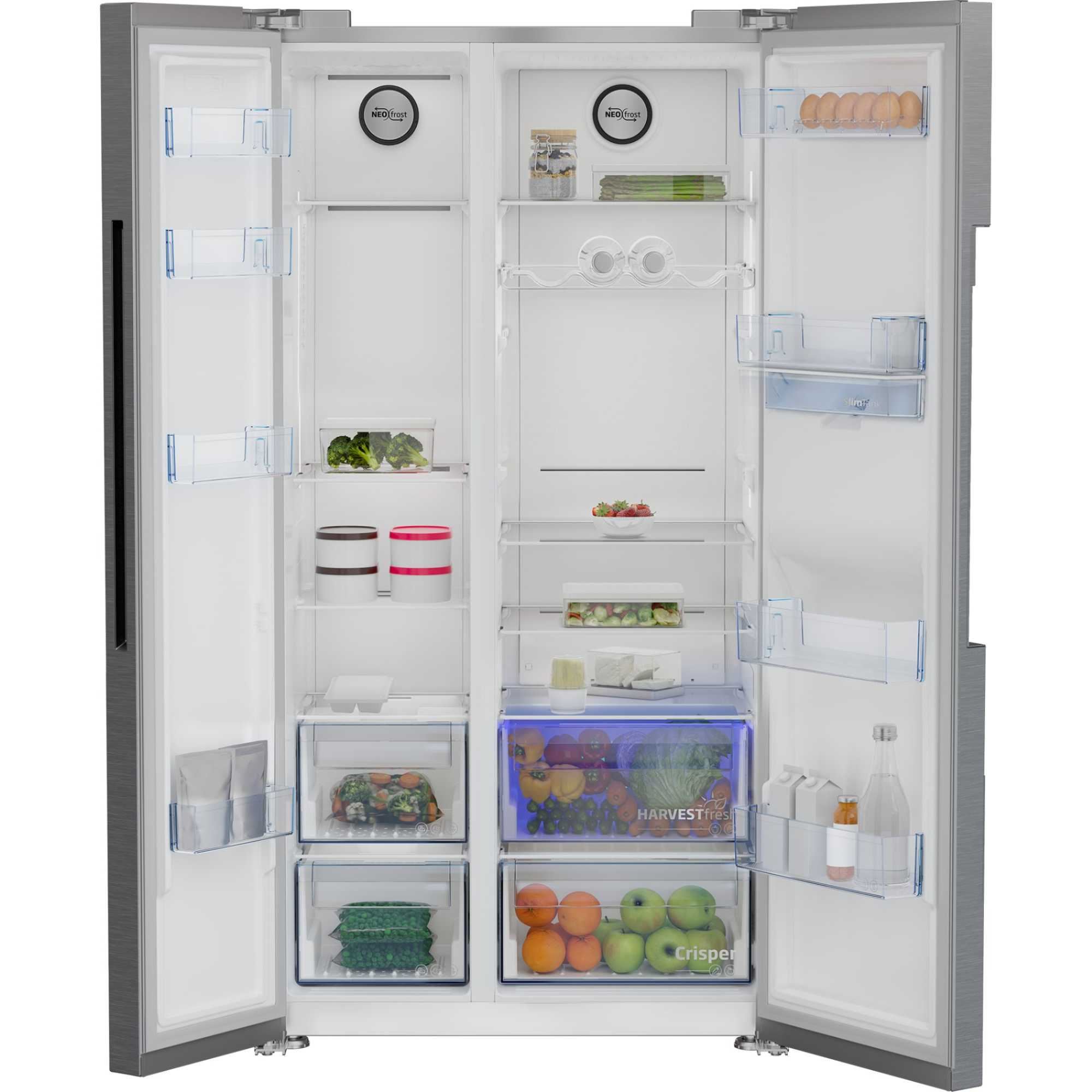The Beko ASD2442VPS American Style NeoFrost Fridge Freezer offers an impressive 576l capacity, ideal for large households. With 364l for the fridge and 212l for the freezer, you have ample space for all your groceries. The NeoFrost technology ensures that food stays fresher for longer by maintaining optimal humidity and preventing ice buildup.
