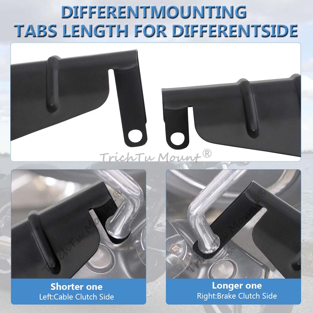 (Note: One of the hand guards has longer mounting tag,it goes on the brake side,the short one goes on the cable clutch side. If you run a 2014 or Newer baggers with a hydraulic clutch , the mounting tabs don't need to be different sizes. If you mind how it looks like, you might need to modify the long one.)