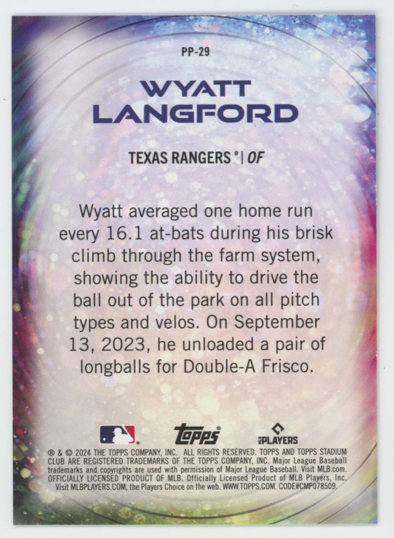 | 2024 Topps Stadium Club Power Packed Wyatt Langford RC Texas Rangers #PP-29 | ||||||||||||||||||||