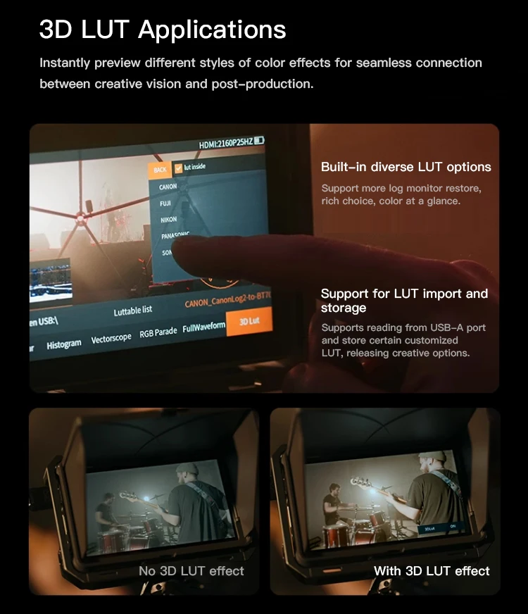 Advanced tools like waveform and 3D LUT for precise control and real-time color grading.