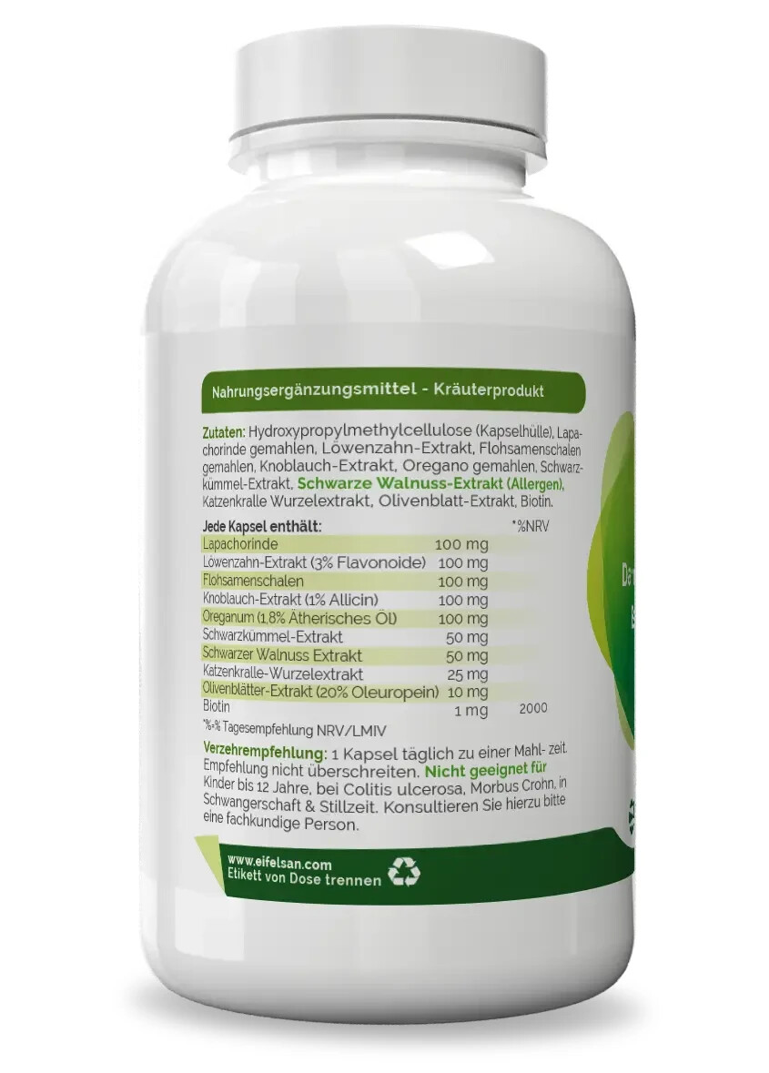 Zutaten: Überzugsmittel Hydroxypropylmethylcellulose (Kapselhülle), Lapachorinde, Löwenzahn-Extrakt 4:1 (Wurzel, enthält 3 % Flavonoide), Flohsamenschalenpulver, Knoblauch-Extrakt (Zwiebel, enthält 1 % Allicin), Oregano-Extrakt (enthält 1,8 % ätherisches Öl), Schwarzkümmel-Extrakt, Schwarzer-Walnuss-Extrakt, Katzenkralle-Wurzelextrakt, Olivenblätter-Extrakt, Biotin.