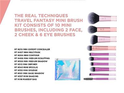 - Real Techniques Travel Fantasy Mini Brush Set includes: Expert Concealer Brush, Multitask Brush, Contour Brush, Medium Sculpting Brush, Medium Shadow Brush, Definer Brush, Spoolie, Smudge Brush, Base Shadow Brush, Shading Brush, & Makeup Bag