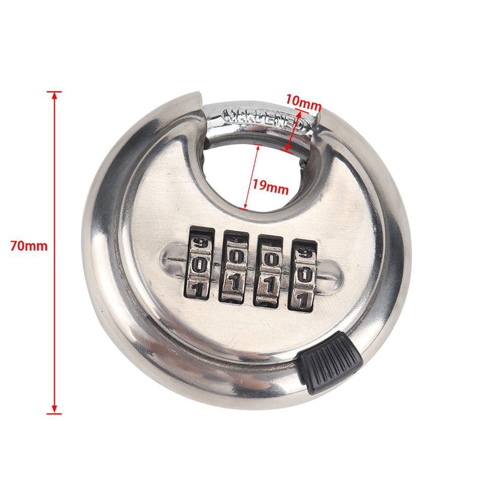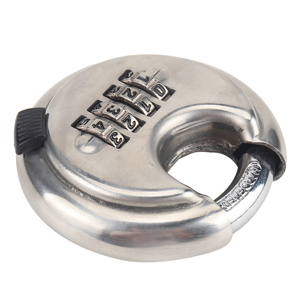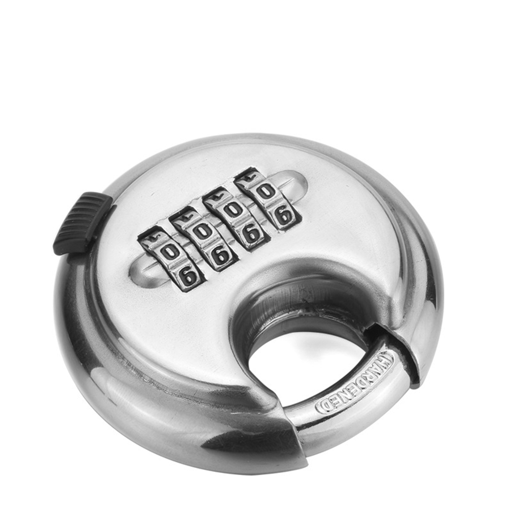 4-digit password padlock, round disc padlock, stainless steel lock, discus lock, silver lock,