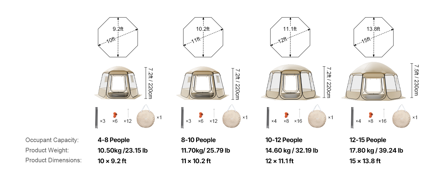 Here we will provide you with 8 types of Sports Tent for your option: 10x9.2ft,11x10.2ft,12x11.1ft,15x13.8ft,47x47inch,50x50inch,63x63inch,72x72inch