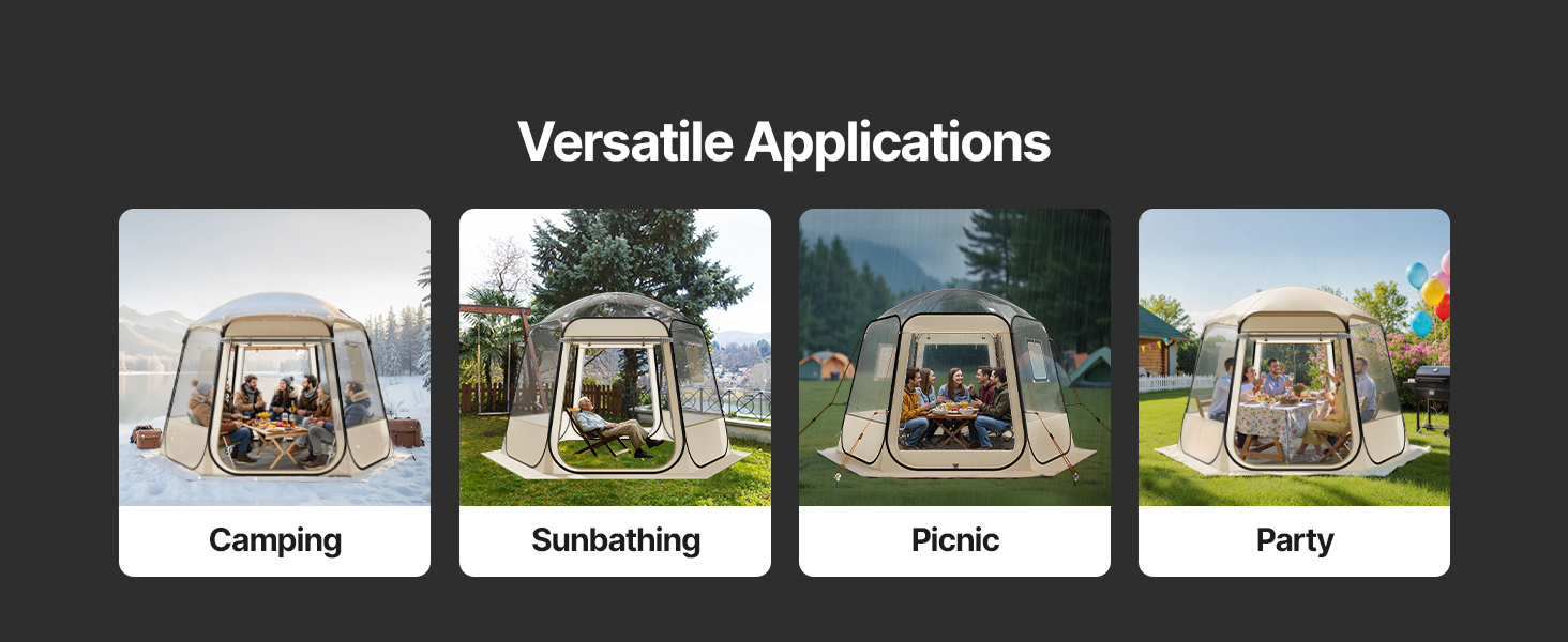 Enjoy quick setup and easy storage! Designed to keep you warm and dry, this clear bubble tent lets you fully embrace the outdoors without the hassle—ideal for camping, relaxing, or simply taking in nature.