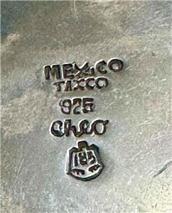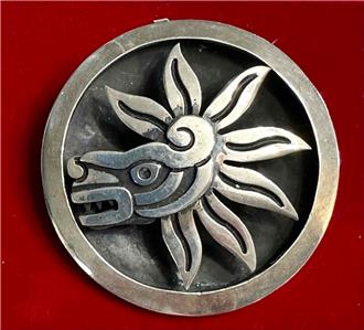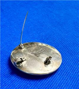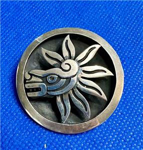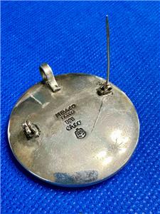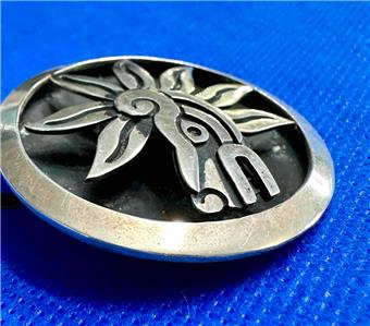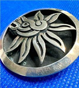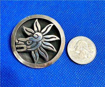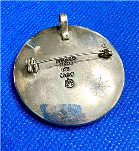Marked Mexico Taxco 925 Cheo with eagle mark 185 Sterling Silver concave round mask combination brooch and pendant. The mask design on the face is highlighted with a darkened shadow box effect. It measures roughly 1-5/8" in diameter and is 5/16" thick. Please examine the attached photos. We will be happy to answer any questions.