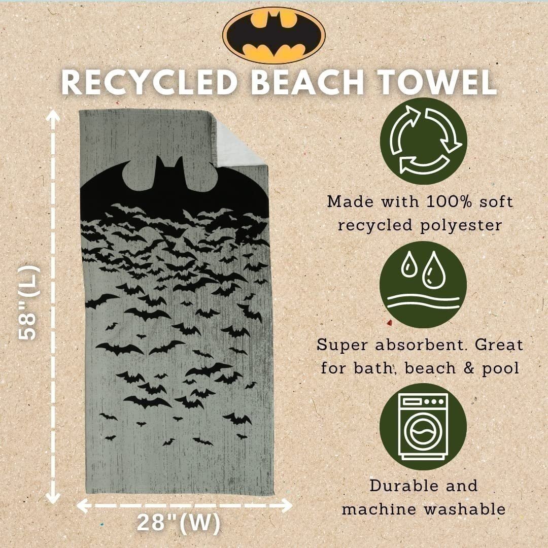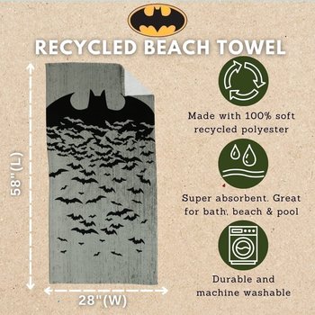 | Description: | Whether it’s beach time or bath time, kids will love getting wrapped up in Gotham style with this Batman beach towel. The dramatic black and grey “Bats Align” pattern on this recycled beach towel makes it easy to spot your Caped Crusader in any setting. This eye-catching lightweight towel is a welcome addition to any linen closet. A sustainable option parents will appreciate, the super soft, eco-friendly towel is made from recyclable plastics and is 100% certified by Intertek. Suitable for indoor or outdoor use, it’s handy at the beach or pool and the dynamic design is also a fun choice for a decorative wall hanging. Bad guys and wet skin beware! With this Batman beach towel on the case, it’s easier than ever for kids to feel safe and dry. Kids will love how the dynamic Bat Symbol design brings a new level of excitement to their bathing and swimming routines. |
