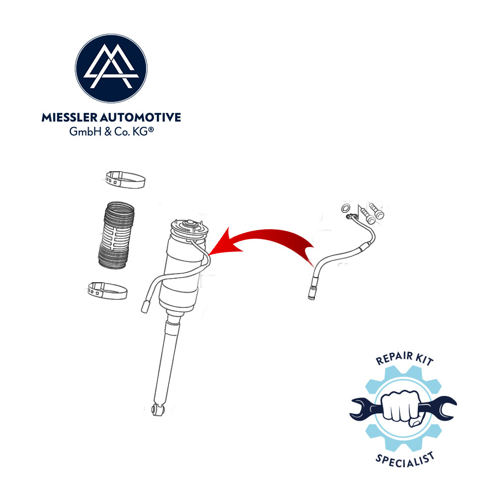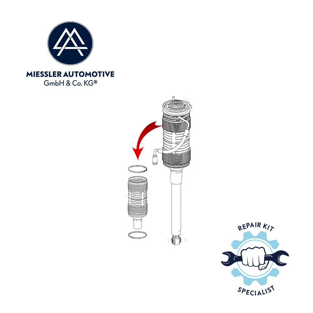 Dieser Reparatursatz für das hintere (Code 487) Federbein (A2213208913, A2213209013) besteht aus einer neuen Staubschutzmanschette (A2213500037) und einem oberen und unteren Fixierring.
