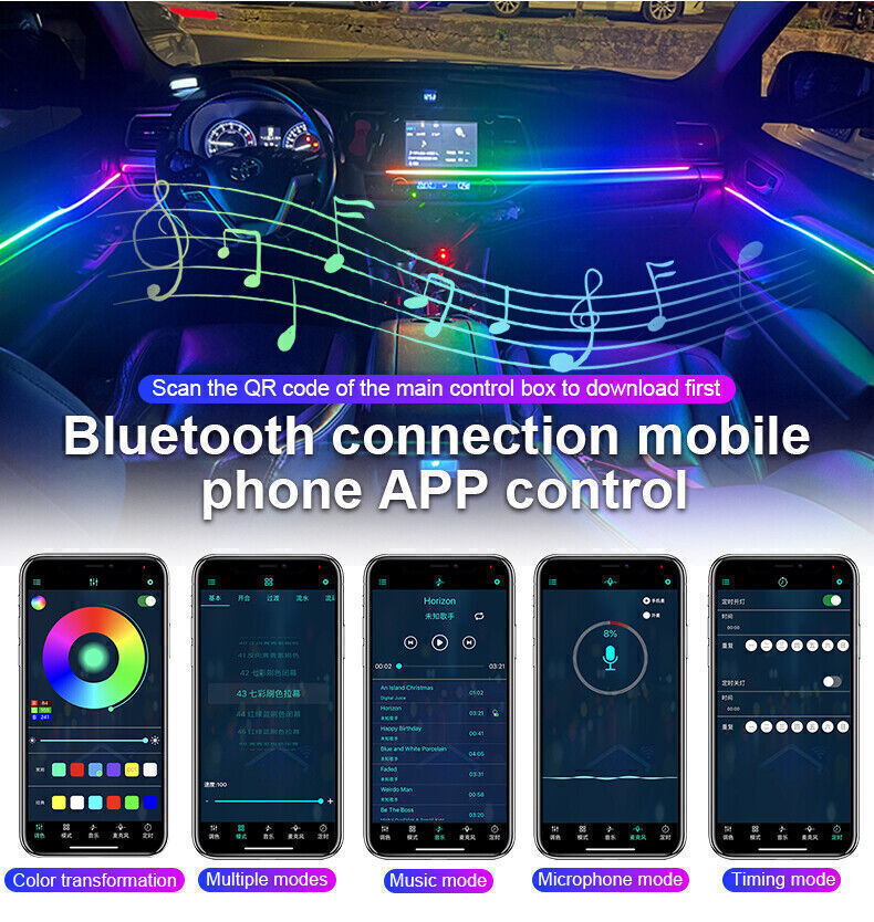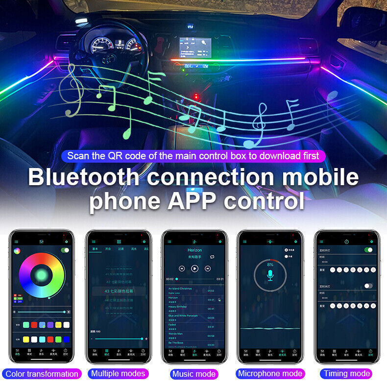 Laden Sie die Anwendung durch den QR-Code auf der Hauptsteuerungsbox zuerst, steuern Lichtmodus über Bluetooth-Verbindung. Dieses Produkt umfasst 1 Hauptsteuergerät, 4 Untersteuergeräte. Jeder Controller hat ein Stromkabel, der Hauptcontroller ist mit einer 5-12V Stromversorgung verbunden, und der Sub-Controller muss auch mit einer 5-12V Stromversorgung wie eine Tür Stromversorgung verbunden werden. Jeder Controller hat Anschlüsse, und die Benutzer können die Position jedes Lichts selbst einstellen. Es ist nicht schwer, unser Produkt zu installieren.