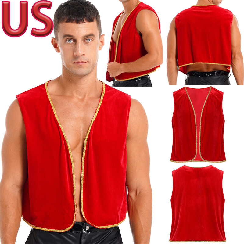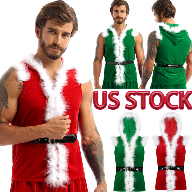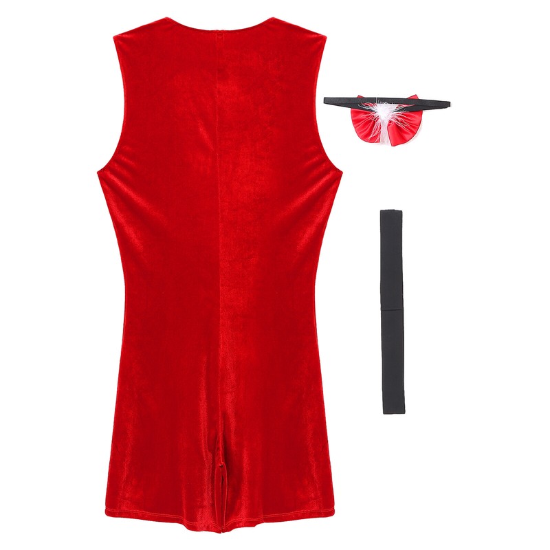 Mens Christmas Costume Deep V Neck Sleeveless Velvet Bodysuit with Belt Bowtie.