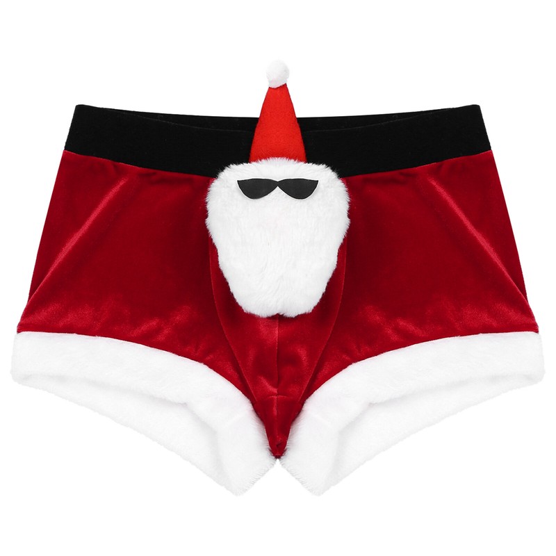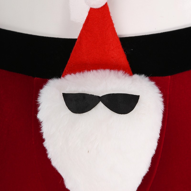 Santa Claus doll in sunglasses and hat is attached to the bulge pouch.