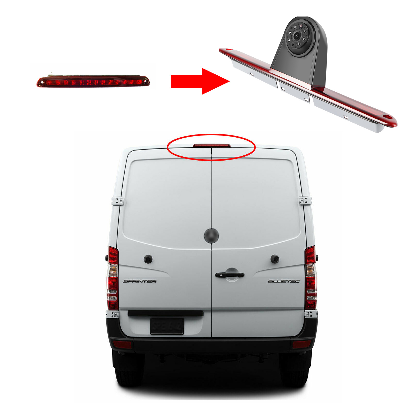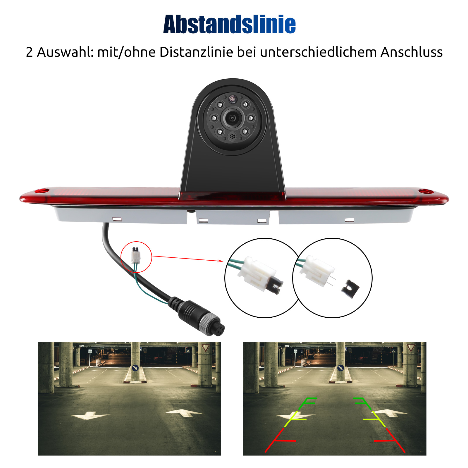 Tipps zur Kamerainstallation: Sie nehmen die äußere Abdeckung Ihrer 3. Bremsleuchte ab und setzten die Spezial Sprinter W906 VW Crafter Rückfahrkamera ein. Das Anschlusskabel wird in das Fahrzeuginnere geführt, dort wird das mitgelieferte 8m Kabel mit Anti-Vibrations Schraubstecker angeschlossen.