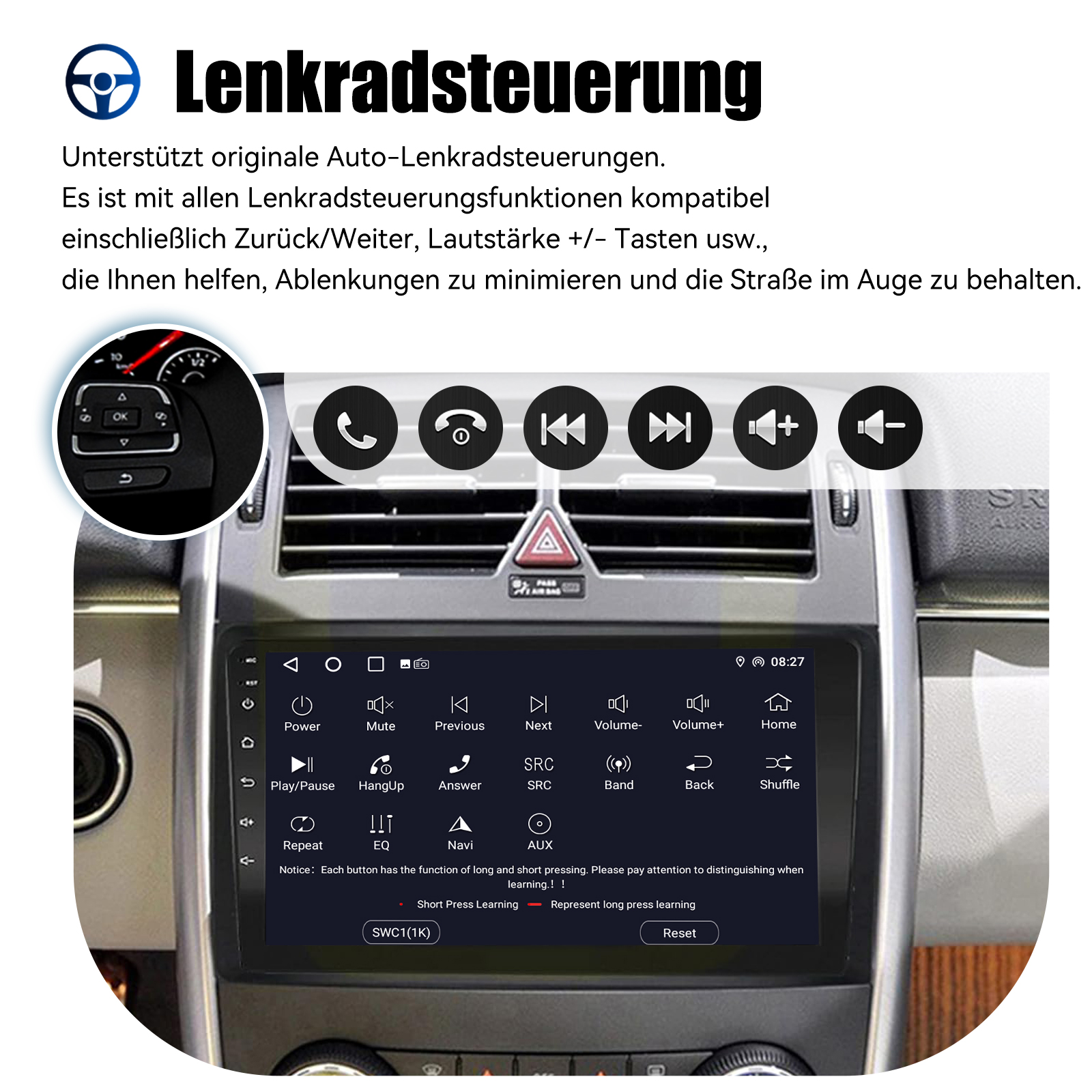 Rückfahrkameraeingang und Lenkradkontrolle: Nach dem Anschluss an die Rückfahrkamera. Das Radio zeigt automatisch das Rückfahrbild an, sobald Sie den Rückwärtsgang einlegen. Machen Sie Ihr tägliches Rückwärtsfahren sicherer. Unterstützt die originale Auto-Lenkradsteuerung (wenn Ihr Auto Canbus nicht unterstützt und SIE die Lenkradtasten lernen), um das Fahren bequemer und sicherer zu machen.