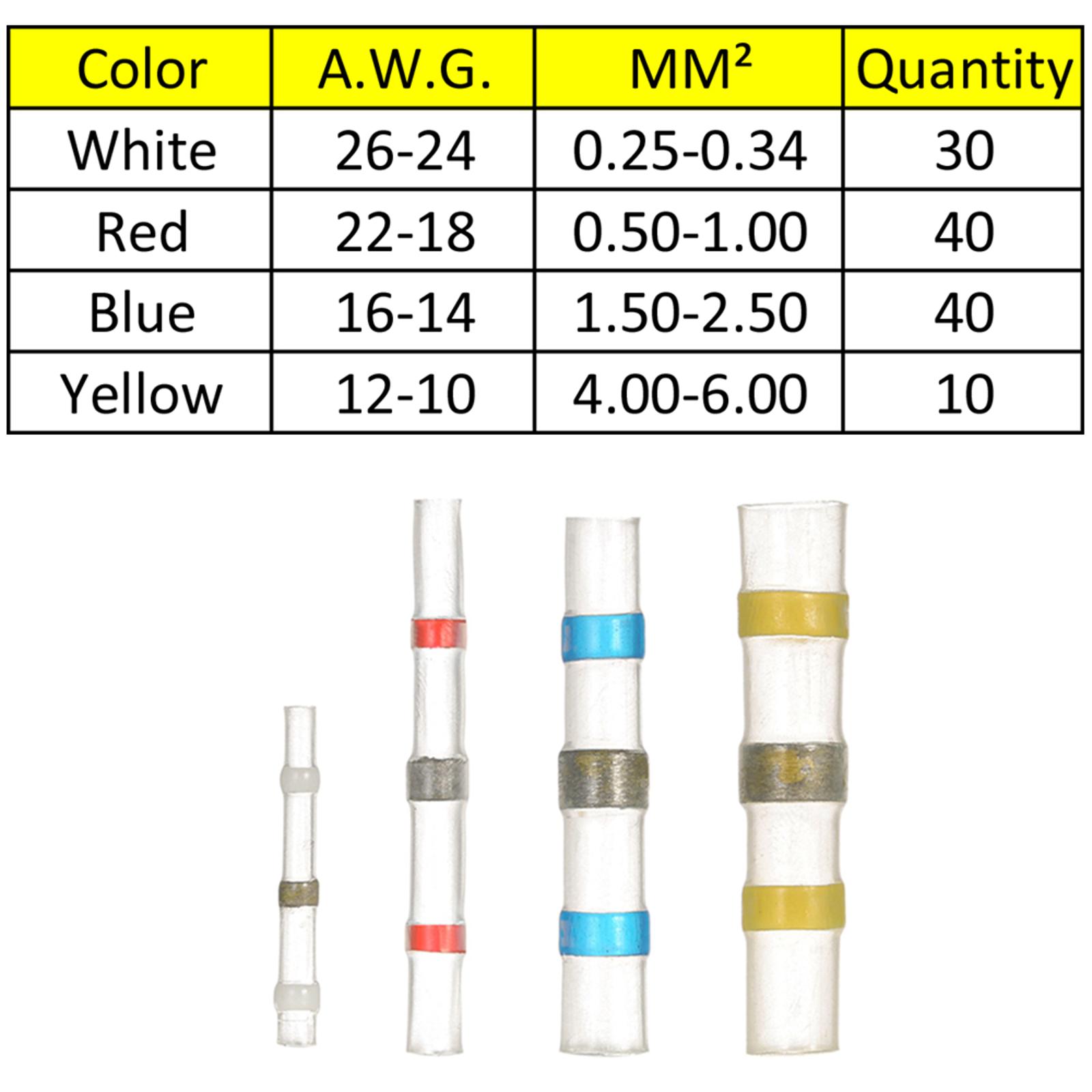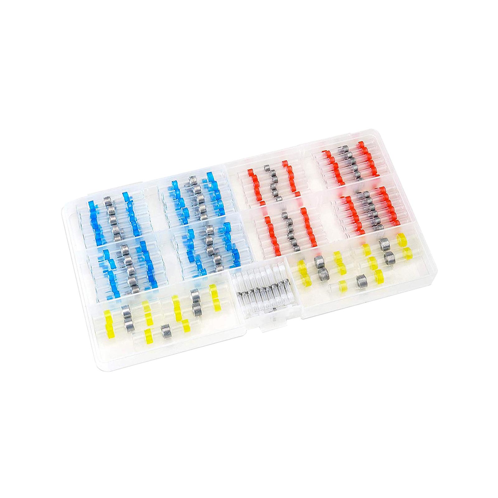 【Contents of Kit】120Pcs cable solder connectors include 30pcs white connectors with size of 26-24 A.W.G. and 0.25-0.34MM²; 40pcs red connectors with size of 22-18 A.W.G. and 0.50-1.00MM²; 40pcs blue connectors with size of 16-14 A.W.G. and 1.50-2.50MM²; 10 yellow connectors with size of 12-10 A.W.G. and 4.00-6.00 MM², a total of 120 pieces. Containing different sizes and multiple quantities can meet your different needs and long-lasting use.