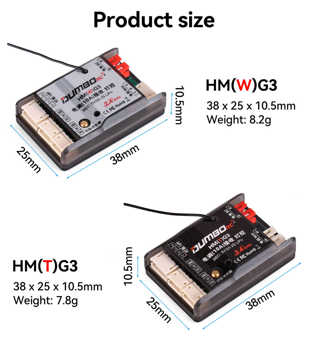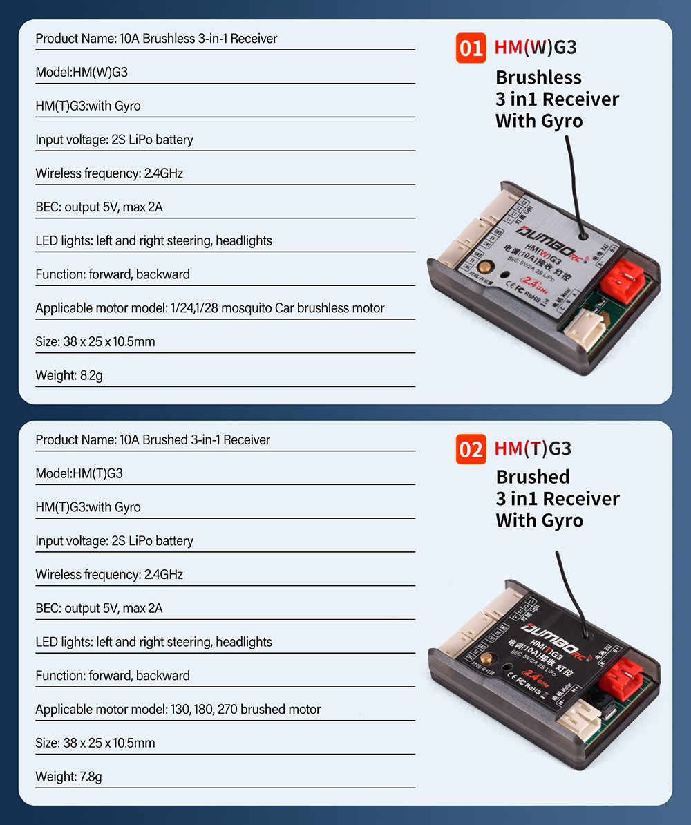 DUMBORC HM(W)G3/HM(T)G3 3in1 Brush Reciver,Built-in 10A ESC,BEC output 5V, 2A max,2S LiPo,with Gyro,Built-in Light Control system,Suit for RC Vehicle Car Boat Tank Airplane Drone.