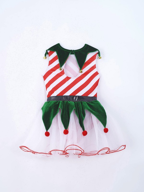 Kids Girls Stripes Print Inverted Triangle Hem with Bells Pom Pom Mesh Tutu Dress.