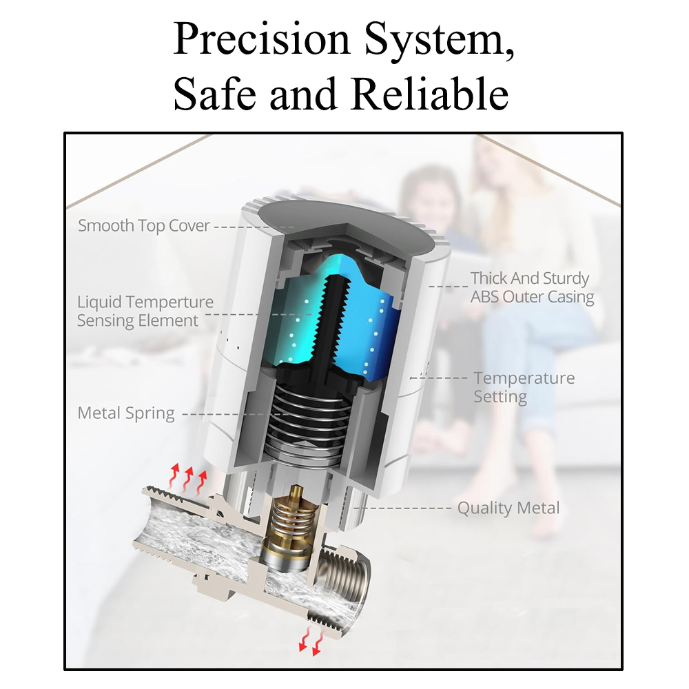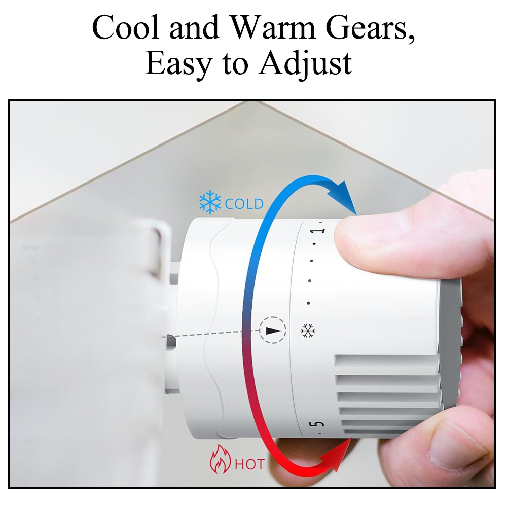 【Temperature Sensing】The surface of the radiator valve replacement head is equipped with a tiny triangle sign, you can manually rotate the temperature adjustment according to the needs, after the adjustment of the regulating valve head's internal temperature sensing device can sense the surrounding air temperature in real time, and automatically adjust the valve opening to achieve the preset indoor temperature.