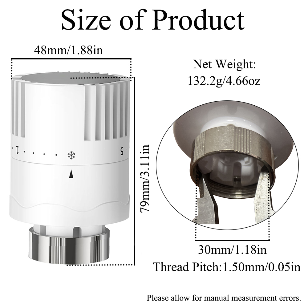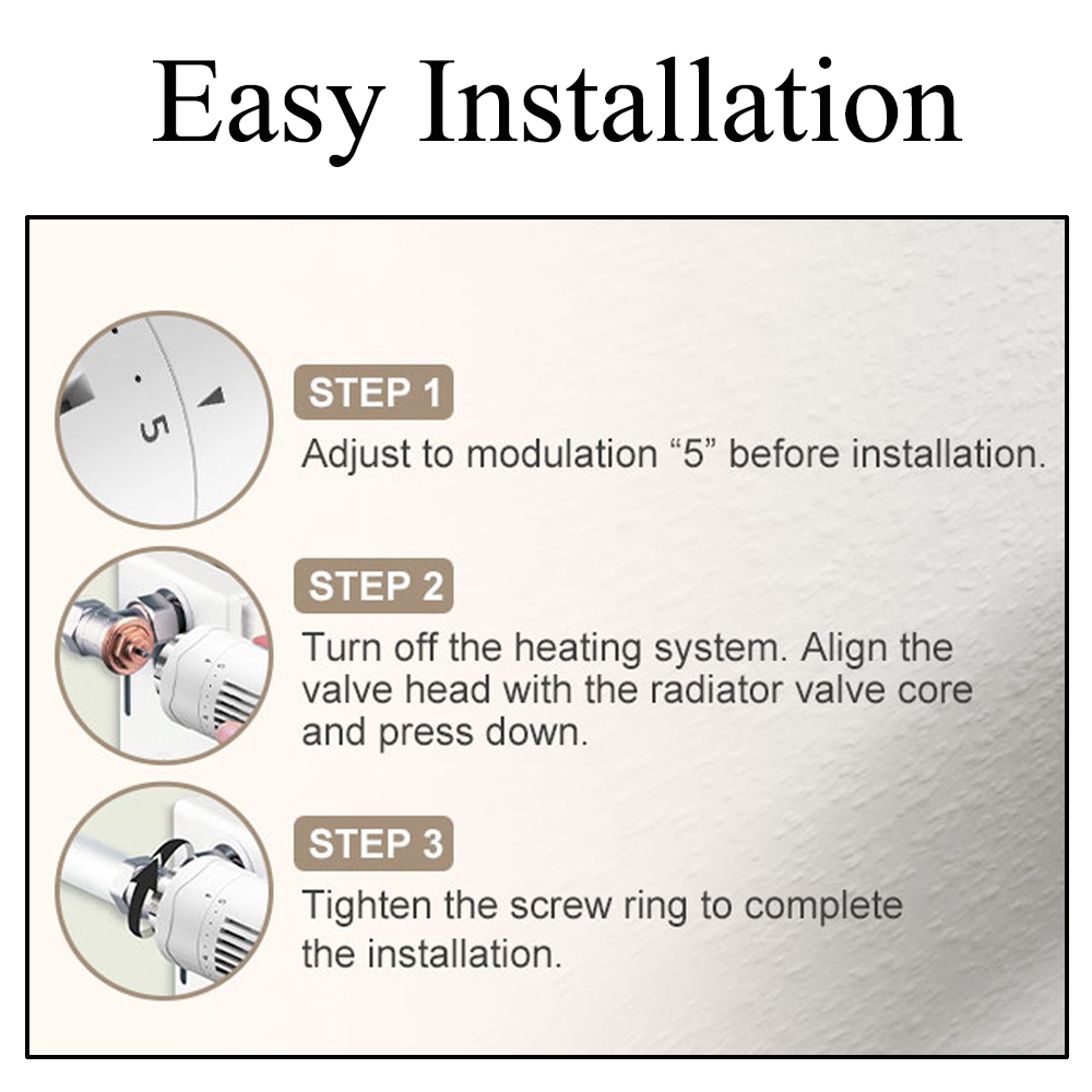 【Strong Compatibility】The thermostat radiator valve head adopts M30*1.5mm standard internal thread design, and most of the standard size valves on the market can be adapted without worrying about compatibility issues. Therefore, this temperature package is not only suitable for family residential heating system, but also widely suited for office buildings, schools, hospitals and other places in the heating system, to provide you with a more comfortable and reliable choice.