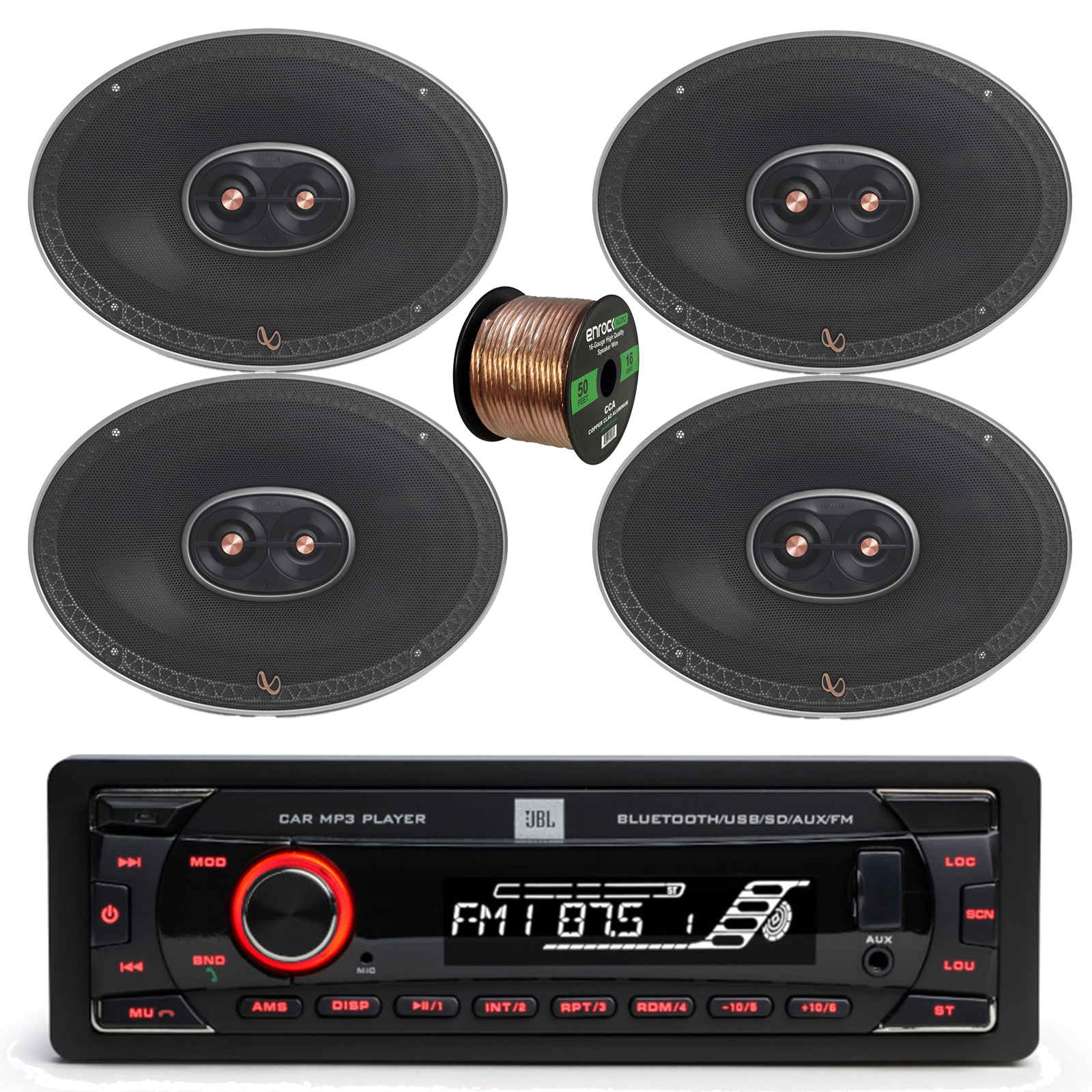 • PACKAGE BUNDLE INCLUDES: JBL Celebrity100 Single DIN USB/AUX Mechless Bluetooth AM/FM MP3 Media Receiver, 4x 6x9" 270 Watt 3-Way Multi Element Car Audio Speakers with 50 Feet 16 Gauge Wire