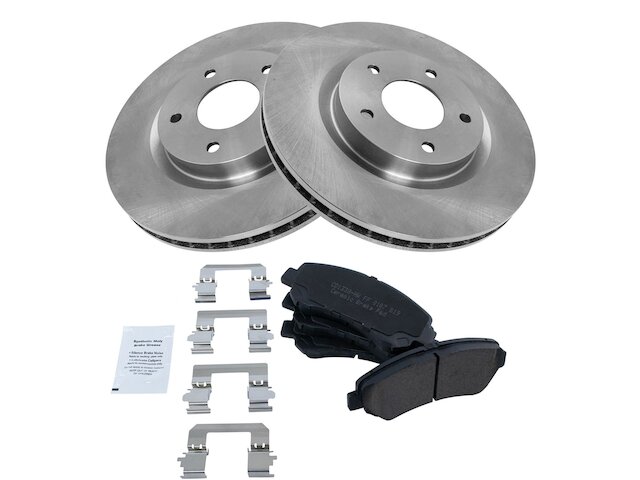 - Package Contents: (2) Front Brake Rotors; (1) 12 oz DOT 3 & 4 Brake Fluid; (1) 13 oz Non-Chlorinated 50 State Formula Brake Cleaner; (1) Front Ceramic Brake Pad Set with Contact Point Grease & Hardware