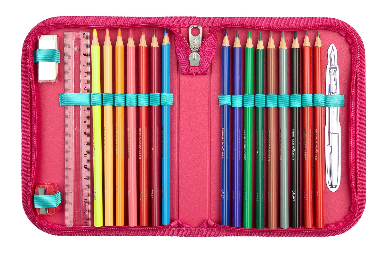 - Lieferumfang: Scooli Federmäppchen mit Etikett, 1 x Lineal, 1 x Radiergummi, 1 x Spitzer, 2 x Bleistift, 14 x Buntstift