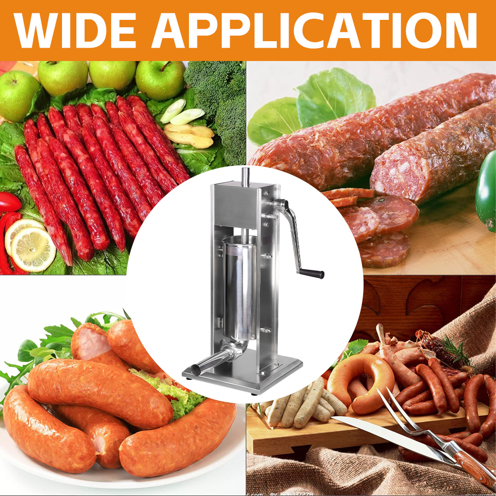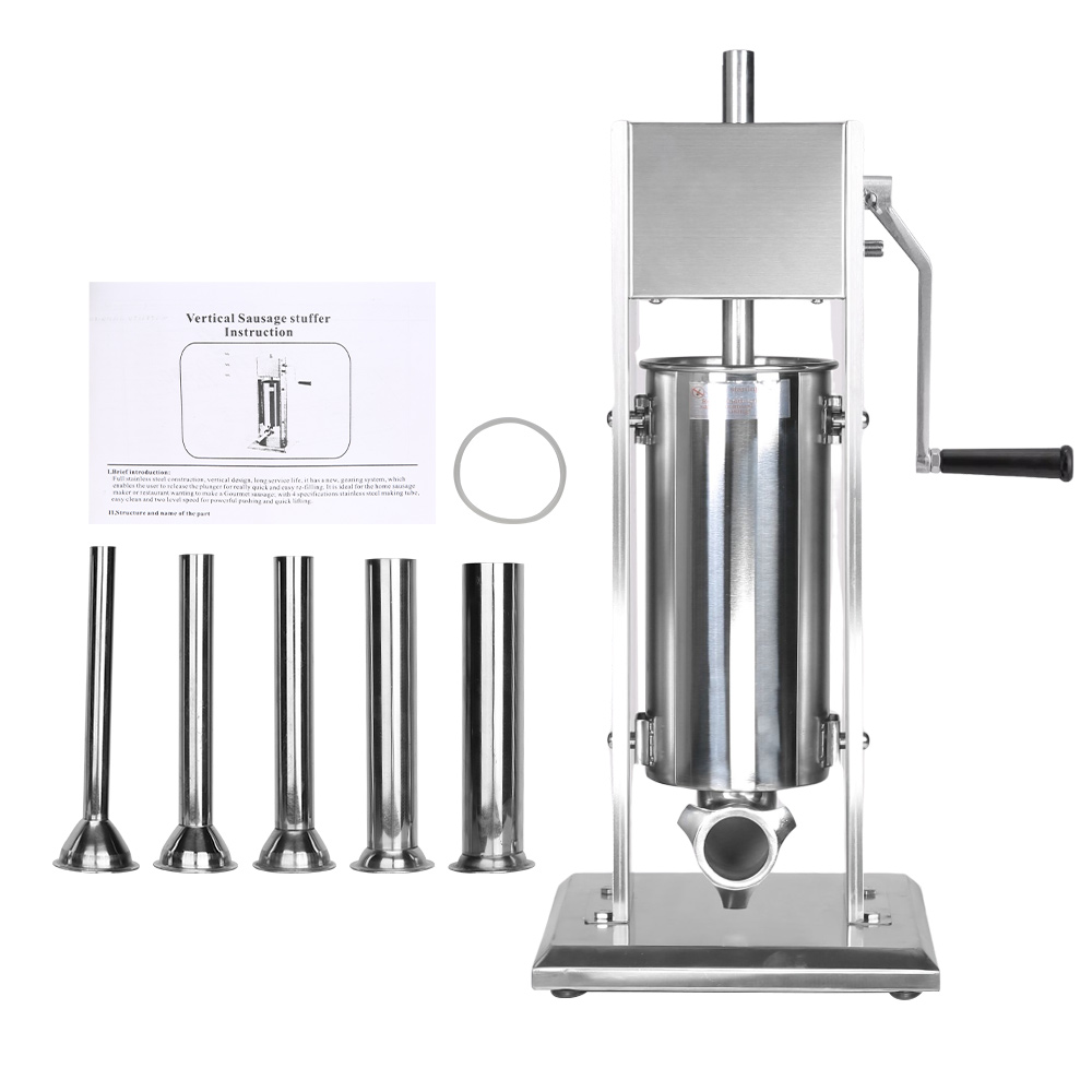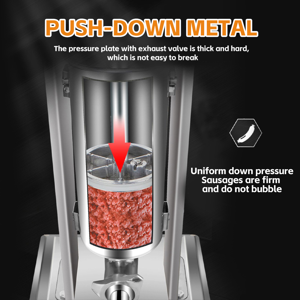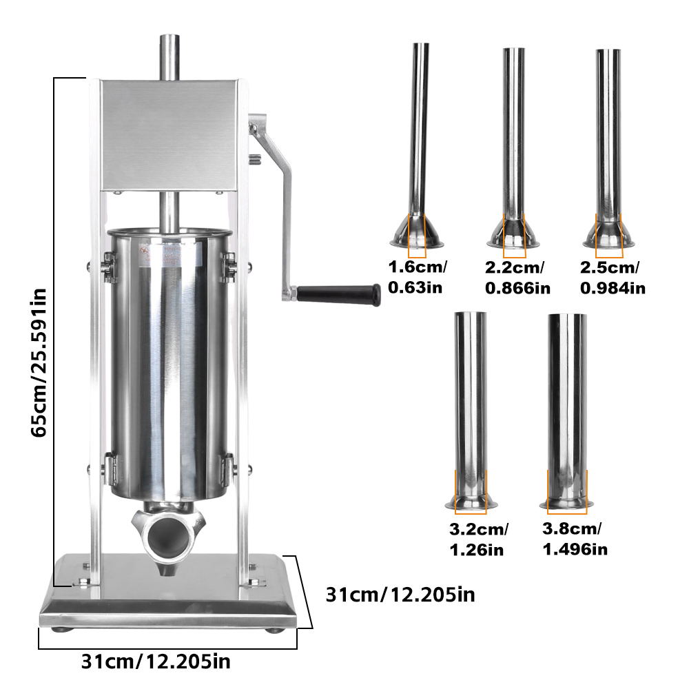 This vertical sausage stuffer comes with four stainless steel stuffing tubes (Φ15 mm, Φ21 mm, Φ30 mm, Φ37 mm) and fried dough sticks, meeting different size requirements to make thin Italian fine sausages, flavored salami, or thicker meat sausages.