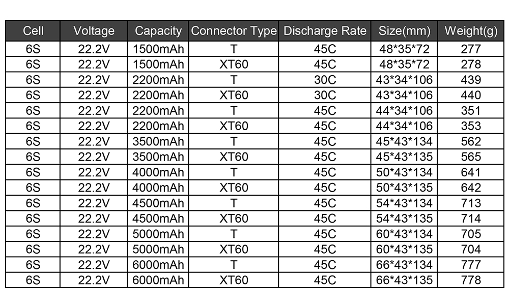 3. High-Capacity Batteries:Choose from 22.2V, with capacities ranging from 1500mAh to 6000mAh, ensuring long-lasting power for RC cars and drones.