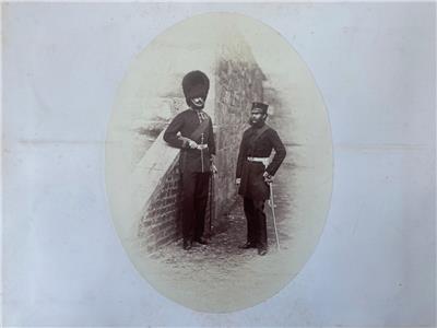 1860s Original Albumen Photograph Grenadier Guards showing HSH Prince Saxe Weimar, Lt Col Bathurst, Sgt Humphreys, Sgt Humphreys, Sgt Smiles, Captain Keep and Sgt Swingler size 20cm x 27cm and on the reverse is a photograoph of Lt Col Clayton and Lt Col Hogge size 16cm x 22cm both photos mounted to a larger card mount and in good condition with some foxing marks to the card mount