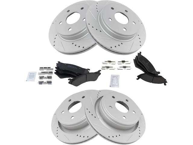 - Package Contents: (1) Front Semi-Metallic Brake Pad Set with Contact Point Grease & Hardware; (1) Rear Semi-Metallic Brake Pad Set with Contact Point Grease & Hardware; (2) Front G-Coated Performance Brake Rotors; (2) Rear G-Coated Performance Brake Rotors