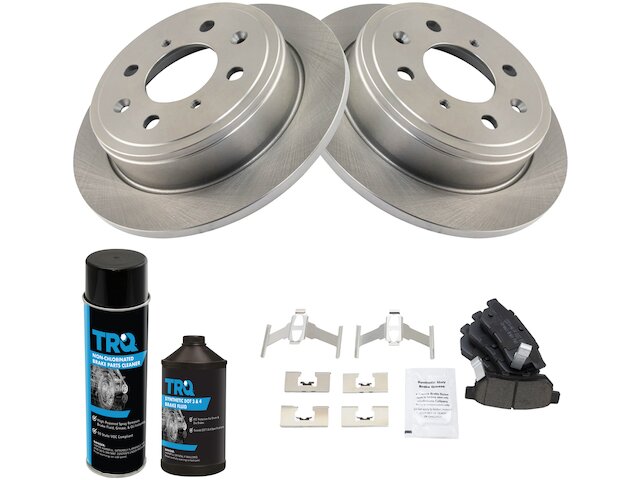 - Package Contents: (2) Rear Brake Rotors; (1) 12 oz DOT 3 & 4 Brake Fluid; (1) 13 oz Non-Chlorinated 50 State Formula Brake Cleaner; (1) Rear Ceramic Brake Pad Set with Contact Point Grease & Hardware