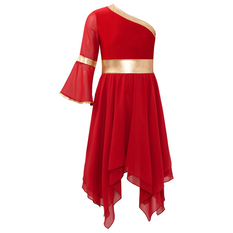 One shoulder design, flare sleeve with sequin trim, gold metallic shiny fabric around the waist to highlight the waistline.