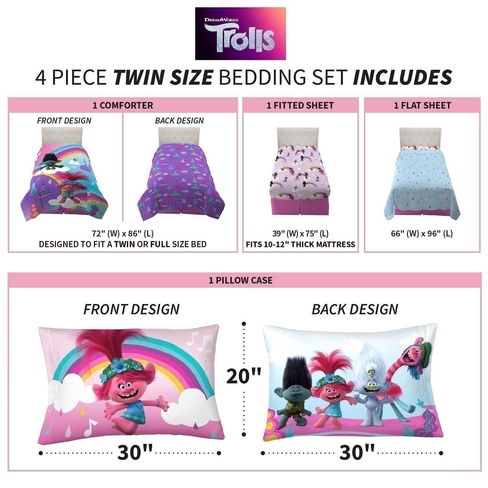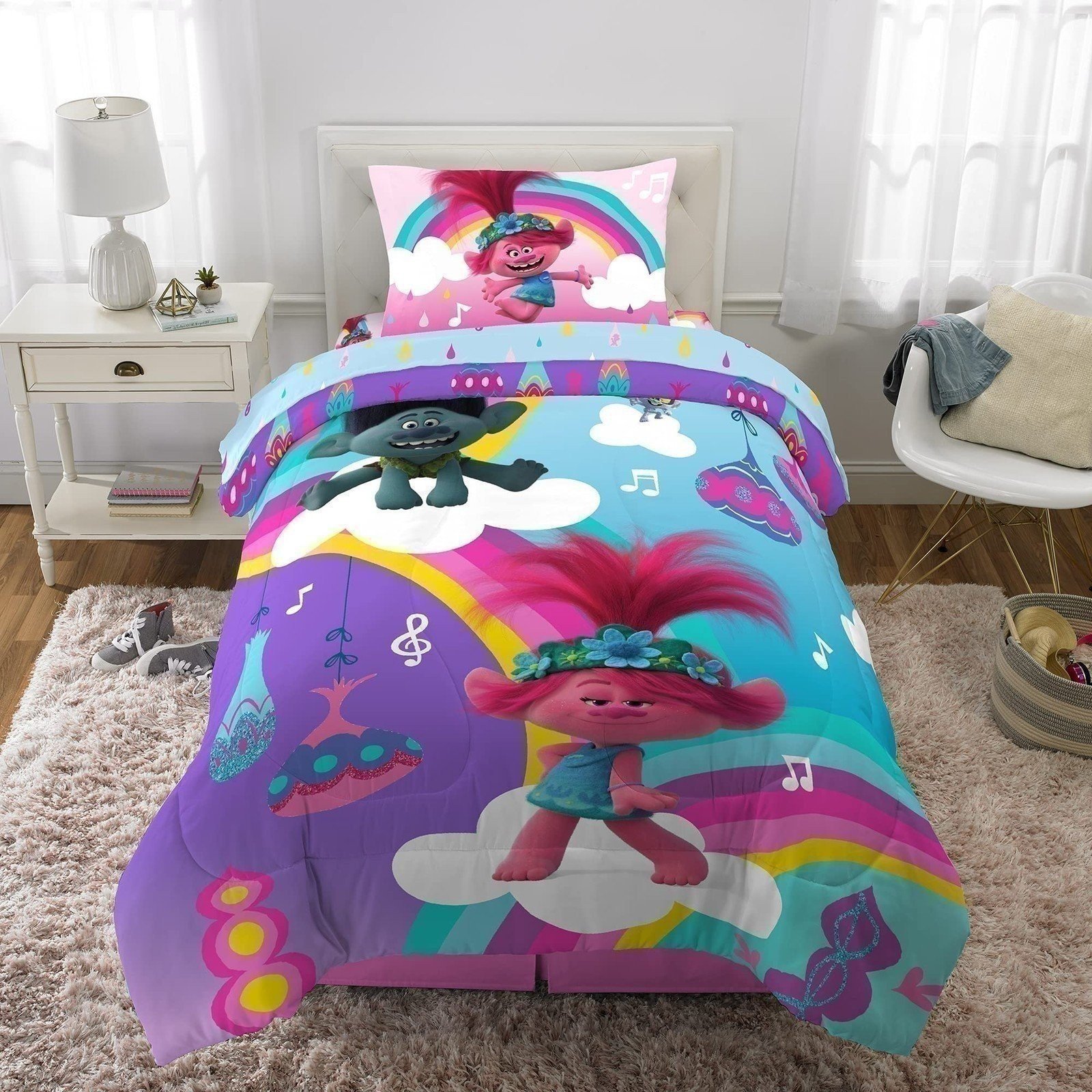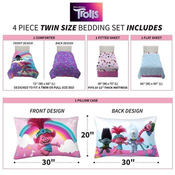 | Description: | Give her bedroom a rainbow-worthy makeover with this colorful bedding set featuring Poppy, Branch, Prince D, Tiny Diamond, King Trollex, Trollzart and Barb from the hit feature Trolls World Tour. This high-quality microfiber set includes a comforter, fitted sheet, flat sheet and pillowcase. The reversible comforter features bold multicolored Poppy, Branch and Tiny Diamond artwork on one side and all-over character art against a purple backdrop on the other. Coordinating colors and imagery on the Trolls World Tour themed sheets and pillowcase help create a cohesive look. In Trolls World Tour, Poppy and the gang work together to unite the six troll tribes through music. Now fans can join in on the fun at home with colorful, high quality bedding that reflects the cheerful charm and inspiring messages of the DreamWorks animated movie.
