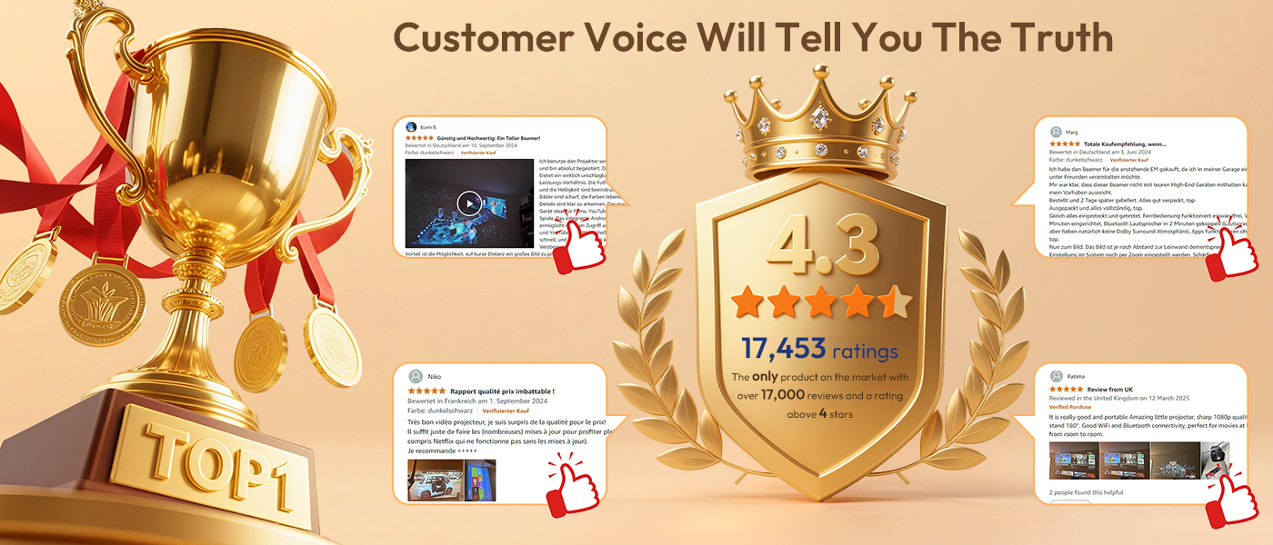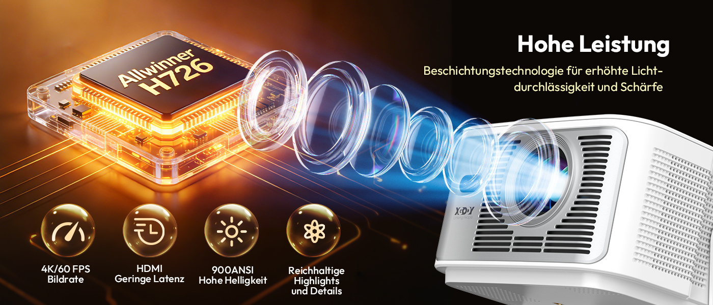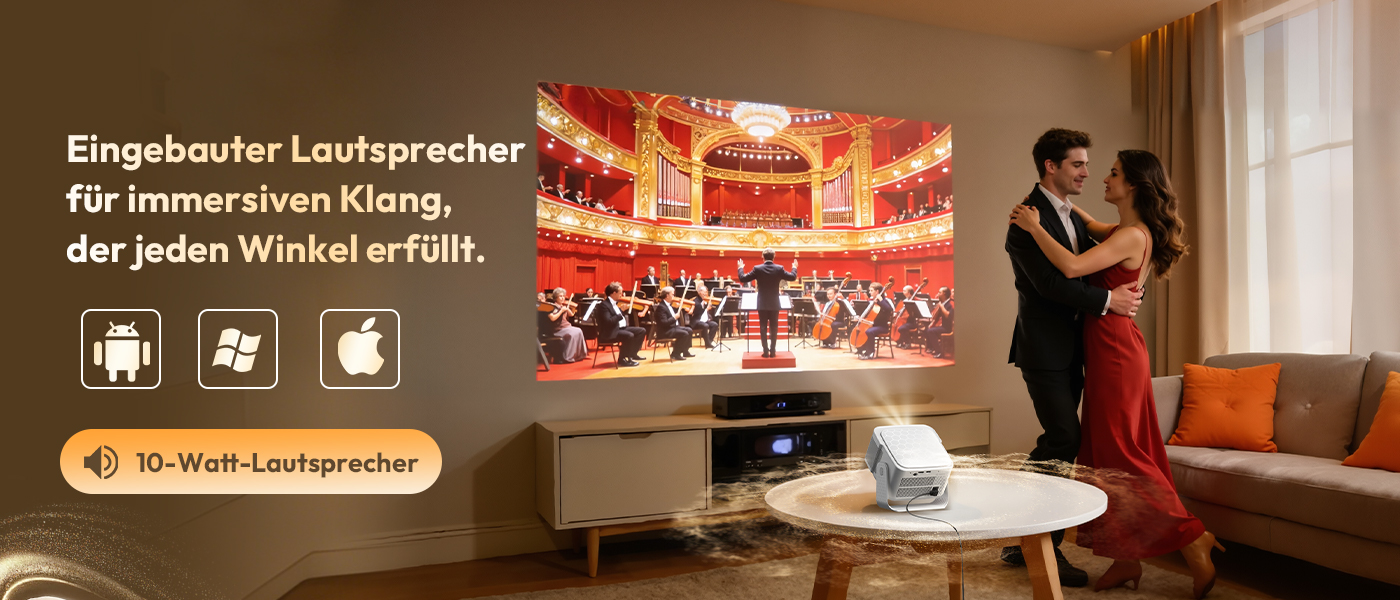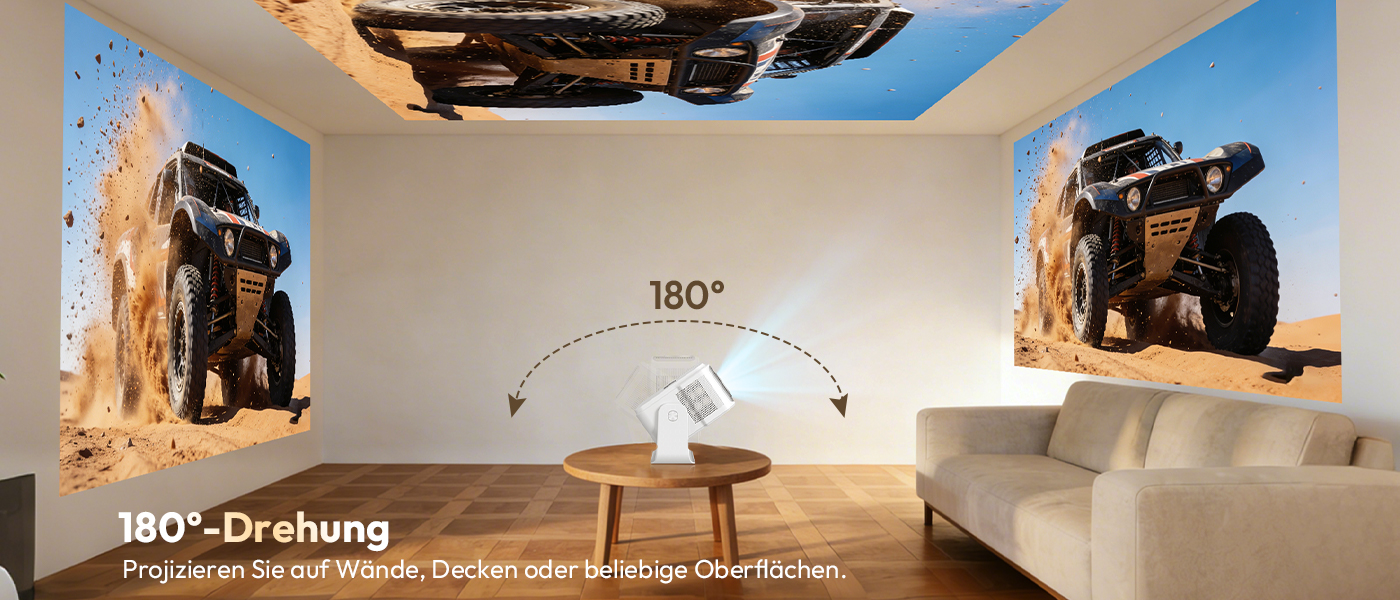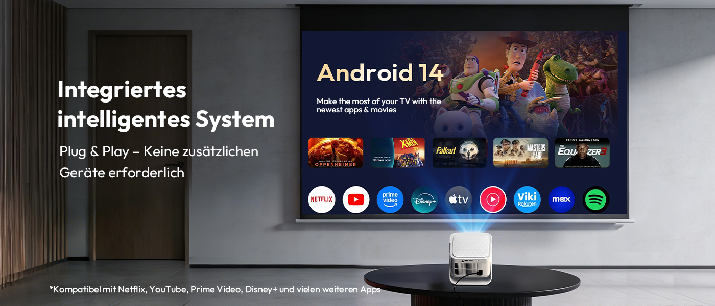 | Spezifikationen: Native Auflösung: 1920 x 1080,Support 8K/4K Helligkeit: 900 Ansi Kontrastverhältnis: 15.000:1 Projektionsgröße: 40–200 Zoll Lampenlebensdauer: 50.000 Stunden Betriebssystem: Android 14.0 Anschlussmöglichkeiten: HDMI, USB, WiFi 6, Bluetooth 5.4 Produktgröße: 222 x 151 x 175 mm (inkl. Halterung)