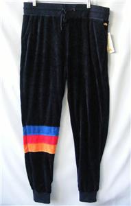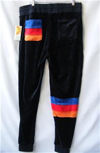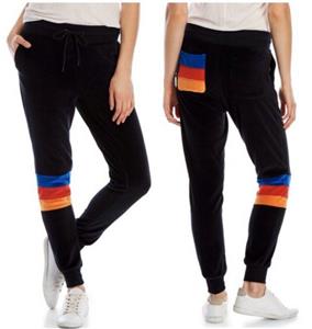 These black, velouor, joggers are super soft and plush, with colorful striped trim, and an adjustable waist.