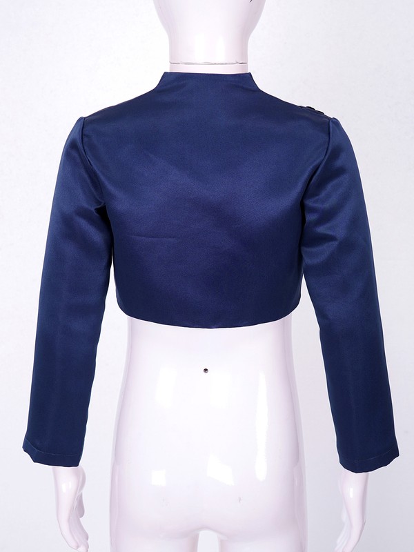 Bolero designs with long sleeve and open front, exquisite applique on right shoulder and smooth lining, cropped length.