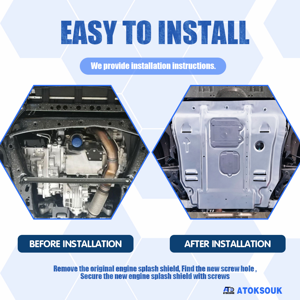 Remove the original engine splash shield, Find the new screw hole ,Secure the new engine splash shield with screws. Suggest professional installation, under normal circumstances, do not need to drill holes.the car model changes, may need to drill holes.