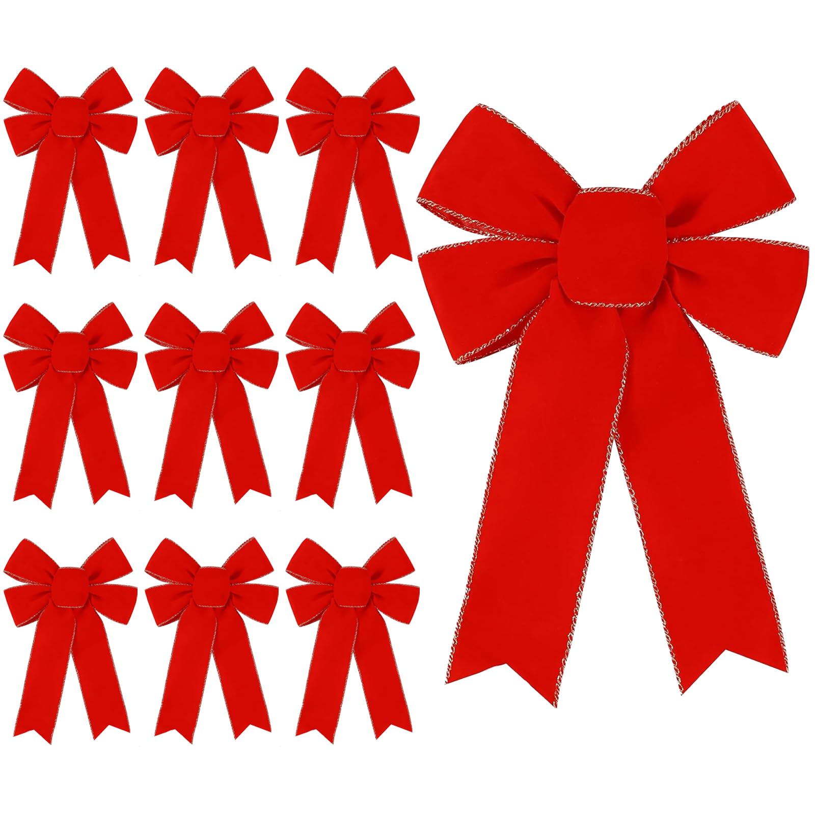 DIYDEC 10PCS Christmas Red Bows Decorations, 9 x 13 Inches Large Velvet Christmas Tree Wreaths Bows with Glitter Gold Edge for Xmas Home Fence Stairs Railing Fireplace Indoor Outdoor Front Door Decor