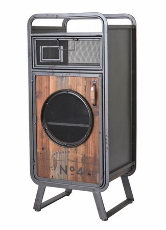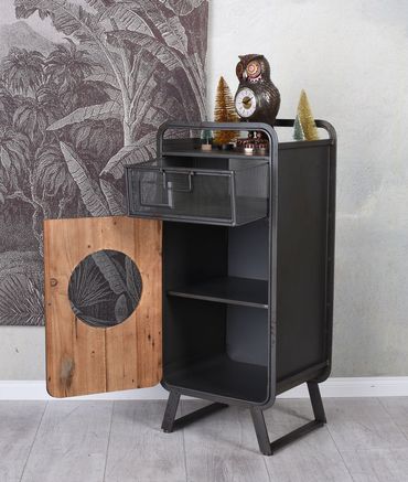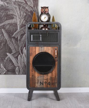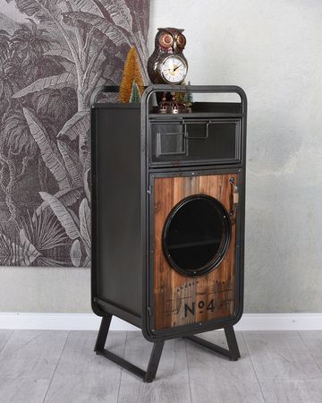 Mit 86 cm Höhe, 38 cm Breite und 31 cm Tiefe ist er platzsparend und dennoch funktional. Die robuste Bauweise und die charmante Optik machen ihn zu einem langlebigen Begleiter mit Loft-Charakter.