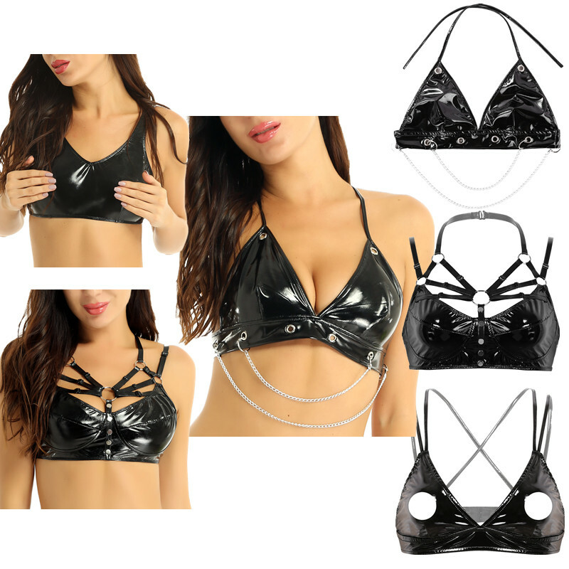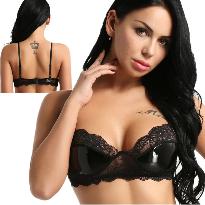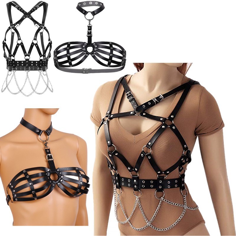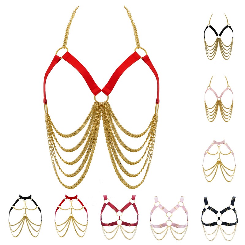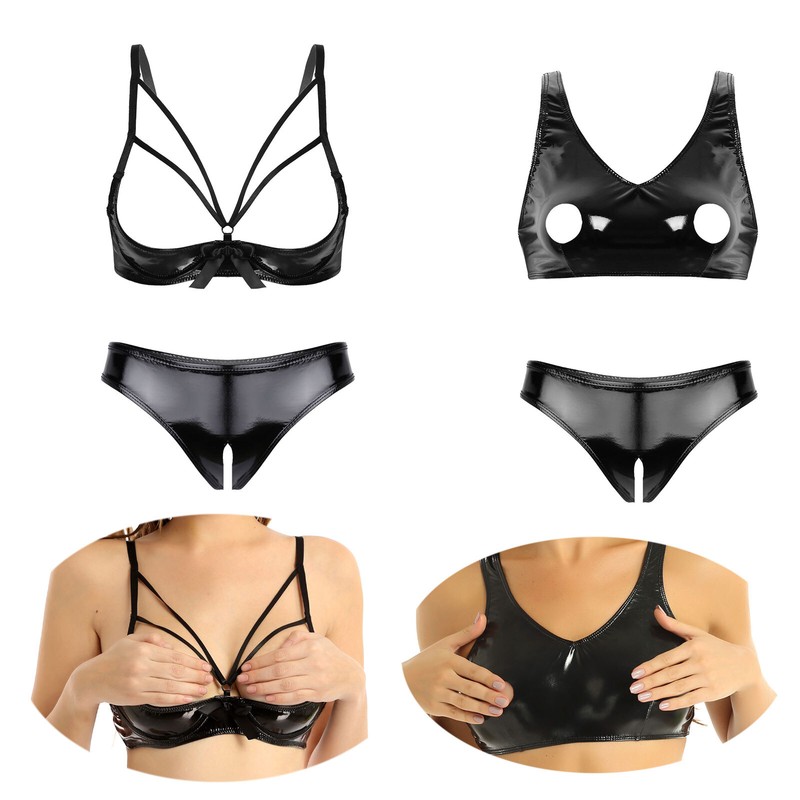 Open bust design, plunge V-neckline, with adjustable elastic shoulder straps.