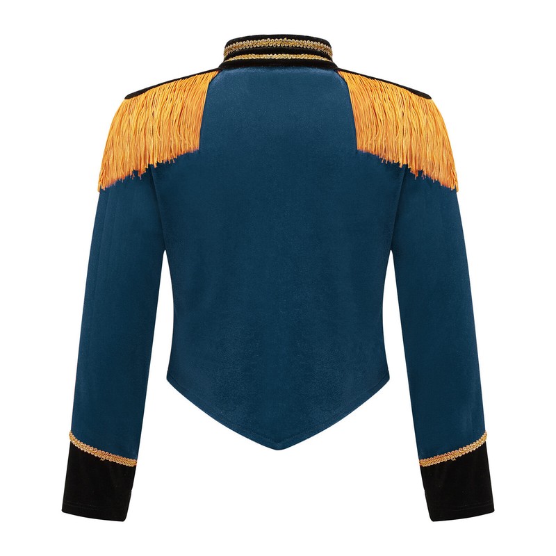 A circus costume jacket for girls, stand collar, long sleeve and front button closure.