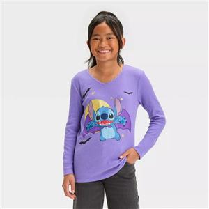This Disney Lilo & Stitch Long-Sleeve Graphic T-Shirt makes a great pick for Halloween or any other casual occasion. Made from lightweight jersey fabric with a length that hits at the waist, this short-sleeve T-shirt offers your child all-day cozy comfort. Designed in a purple hue and featuring a ribbed construction, this V-neck tee has a graphic showing Stitch with purple bat wings flexing his claws with a setting sun in the background for fan-favorite style, and the knit pattern along the neckline lends it extra flair.