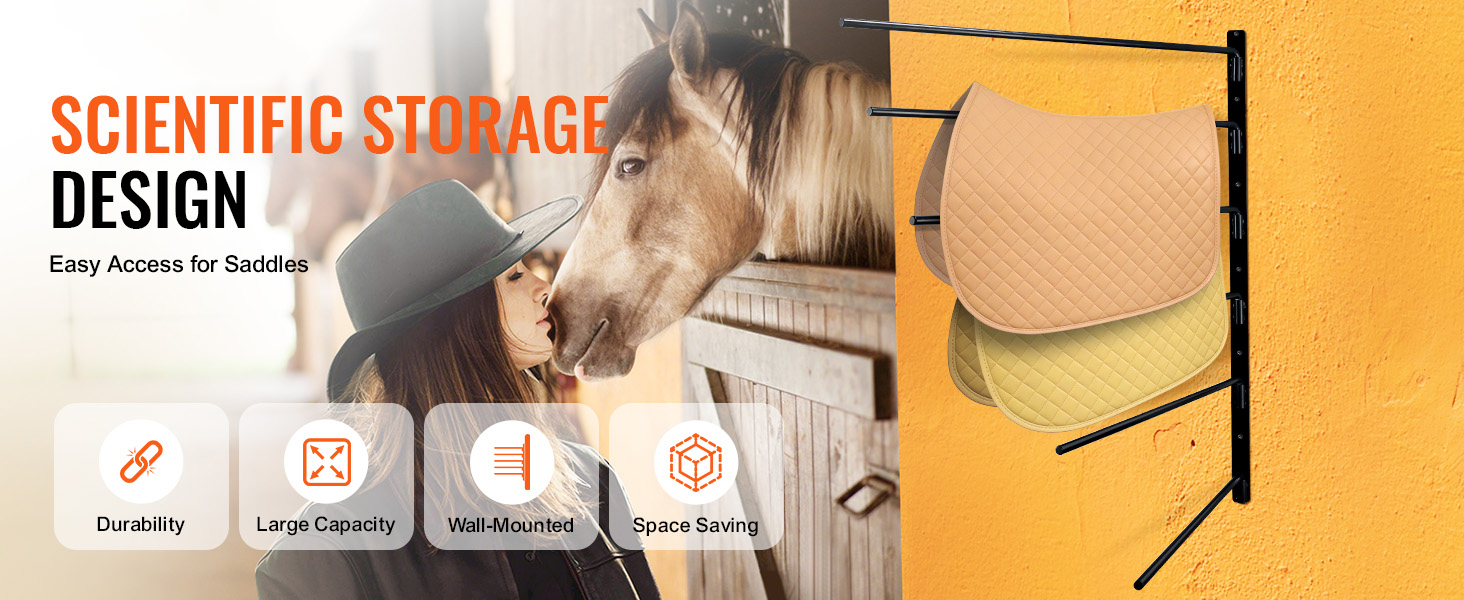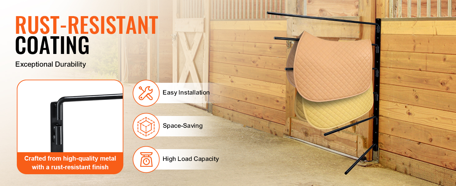 This six-layer saddle rack features a rotating design for easy organization. With a sturdy full steel structure and full welding, it’s durable and accessible. It fits various tack and can store clothes and tools, keeping your space tidy. Install it in just four easy steps!