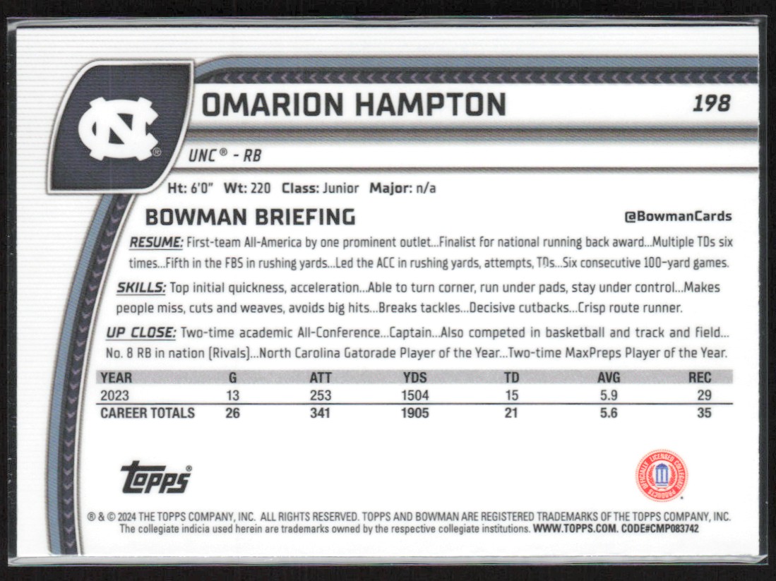 | 2024 Bowman University Chrome Base Omarion Hampton North Carolina #198 | ||||||||||||||||||