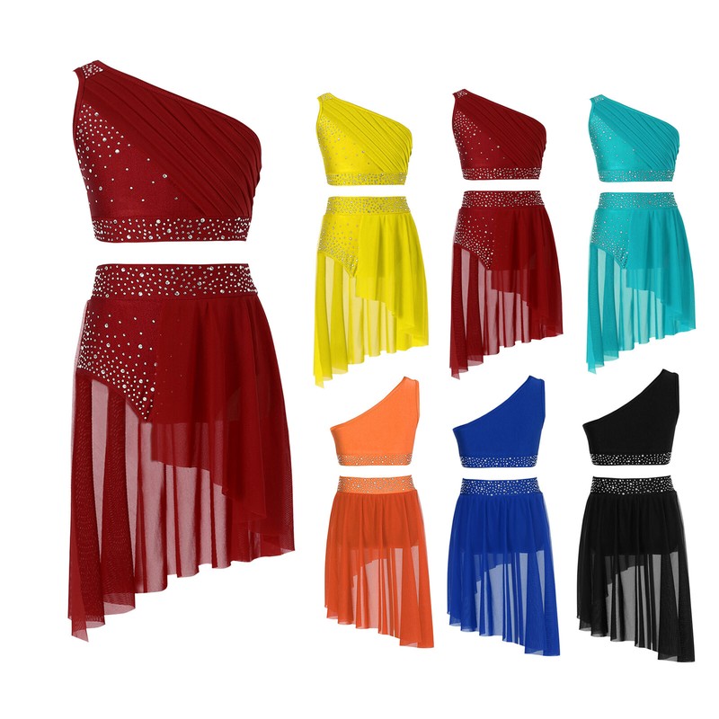 Kids girls’ lyrical dance performance outfit with rhinestones that sparkle under the light to brighten up any performance.