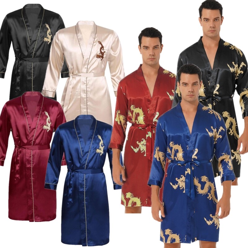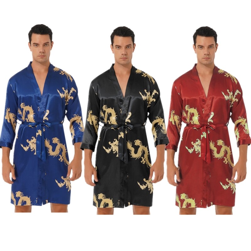 Mens Open Front Hooded Night-robe Satin Belted Kimono Half Sleeve Bathrobe.