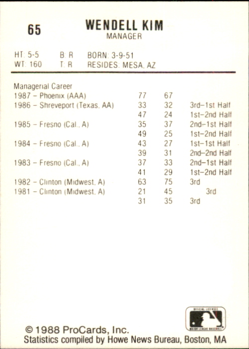 1988 Phoenix Firebirds ProCards #65 Wendell Kim Manager Mesa Arizona AZ NM Card