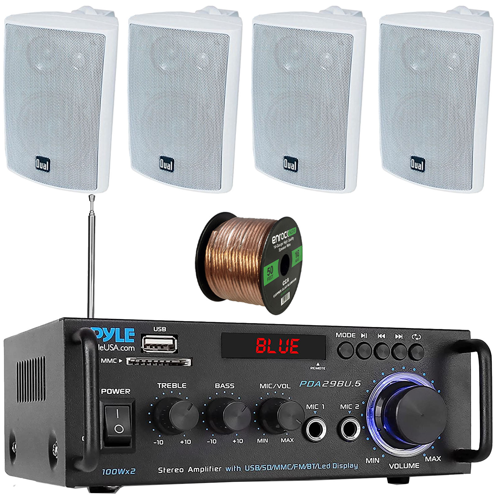 PACKAGE BUNDLE INCLUDES: Pyle PDA29BU.6 Bluetooth USB/SD/FM Compact Power Stereo Home Audio Amplifier Receiver - Blue Series with Wireless BT, RCA & Speaker Terminals, 4x Dual Electronics LU47PW 4" 200W Max Power 3-Way Indoor/Outdoor White Speakers, 50 Feet 16 Gauge Speaker Wire